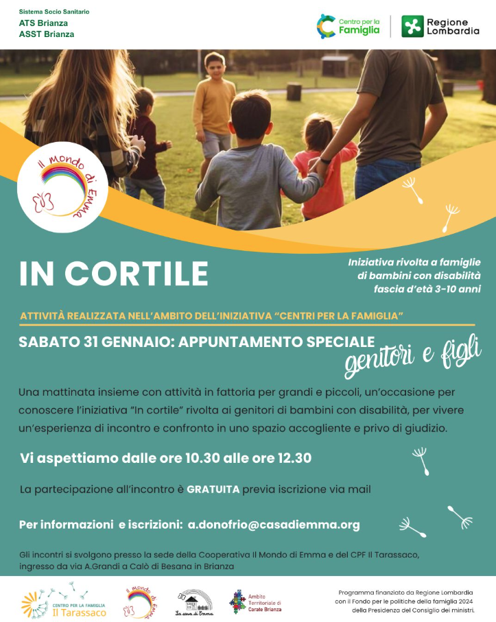 Sabato 31 gennaio dalle ore 10:30 alle 12:30 presso la sede della Cooperativa Il Mondo di Emma e del Cfp Tarassaco, ingresso via A. Grandi Calò, Besana in Brianza.