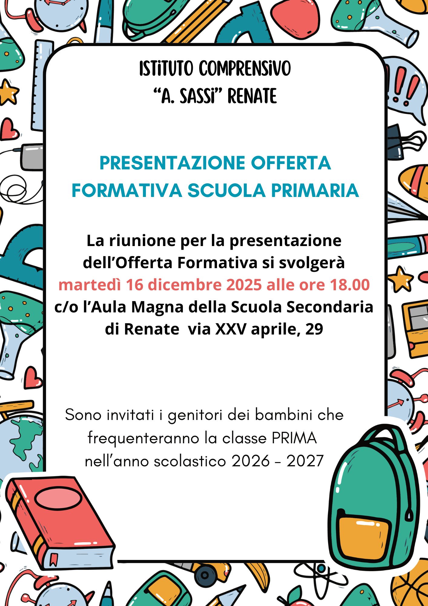 Presso l'aula magna dell'Istituto Comprensivo A.Sassi di via XXV Aprile, 29 sarà presentata l'offerta formativa per i genitori dei bambini che frequenteranno la classe prima nell'anno scolastico 2026/27