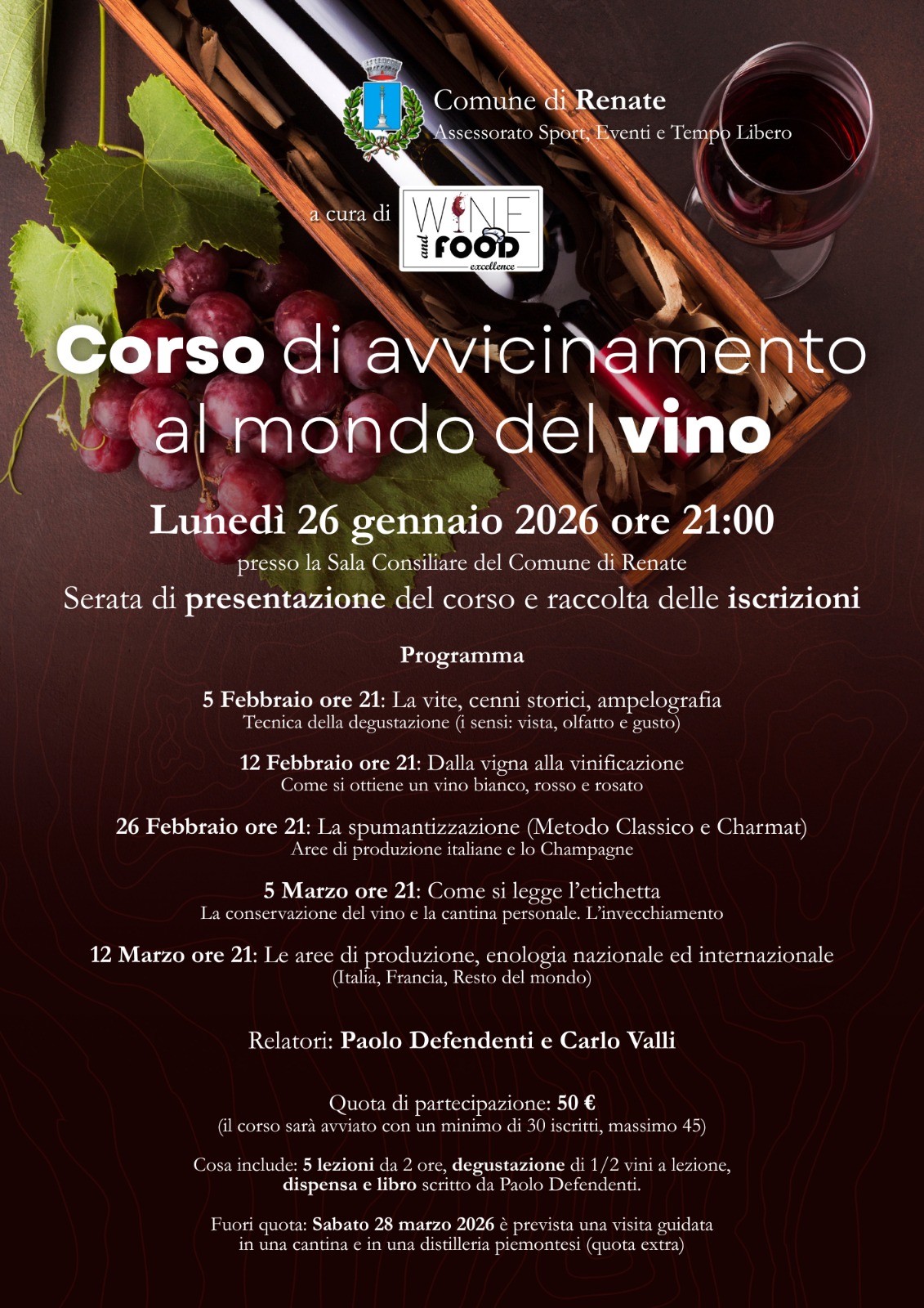 L’Assessorato allo Sport, Eventi e Tempo Libero del Comune di Renate promuove il nuovo "Corso di avvicinamento alla cultura enologica". L'iniziativa, curata da Wine and Food Excellence, si propone di offrire ai cittadini un percorso formativo e sensoriale alla scoperta di uno dei simboli più prestigiosi del nostro Paese.